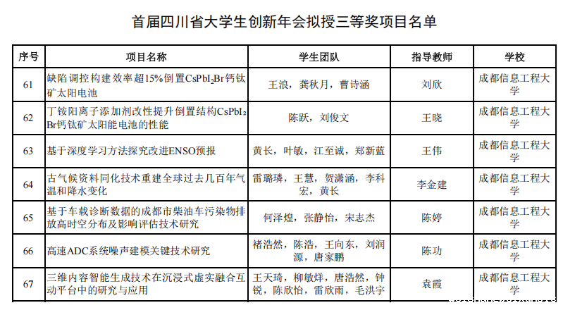 【本网讯】7月4日至6日,由省教育厅主办、成都师范学院承办的首届四川省大学生创新年会(主题“创享无限实践有为”)在成都师范学院温江校区举行。我校推荐的12个参赛项目中,8个项目斩获佳绩。其中,资源环境学院褚永彬指导的《环绿骑迹—城市绿道骑行服务管理平台》(团队成员蒲萍等5人)聚焦绿色出行,以智能化优化服务管理,获二等奖;光电工程学院刘欣、王晓,大气科学学院王伟、李金建,资源环境学院陈婷,通信工程学院陈功,计算机学院袁霞指导的7个项目获三等奖,展现了我校师生的创新创业实力。